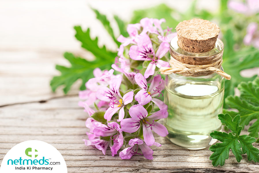 A sweet, floral-scented oil extracted from geranium leaves, known for its balancing and anti-inflammatory properties, used for aromatherapy and skin care.
