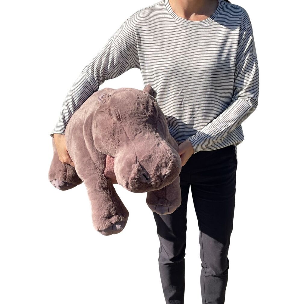 A plush toy modeled after a hippo, with a round body and friendly face, providing a huggable companion for children.