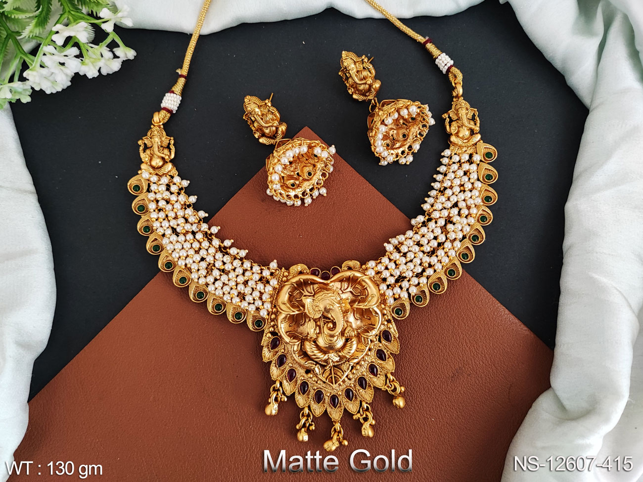 Traditional Indian necklace sets inspired by temple architecture, known for their intricate designs and use of gold and gemstones.